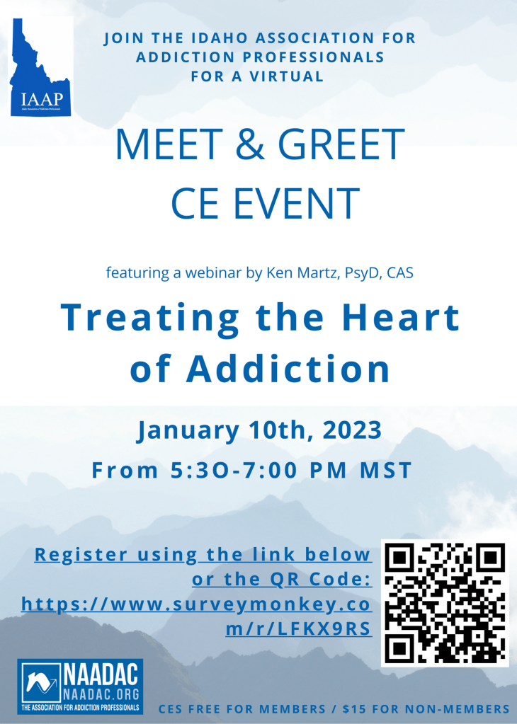 Join IAAP on January 10th, 2023 from 5:30-7:00 PM MST for a Meet & Greet CE Event featuring a webinar by Ken Martz, PsyD, CAS Treating the Heart of Addiction. Attached is the flyer!